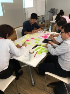 後半のワークでは、「自分達の組織は全くイノベ―ティブな組織でない」という仮のテーマを設定し、グループ毎にこの問題を解決するアイデアを、弊社が勧める手順に沿って練ってもらいました。各グループとも、とてもユニークかつクリエイティブなアイデアが生まれていました。
